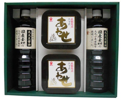 「国産素材丸大豆醤油」と「長期熟成味噌」がセットになったギフトセットです。