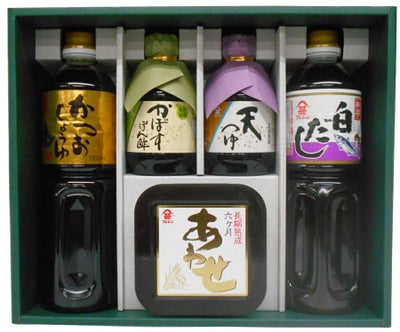 定番のかつおしょうゆ、「長期熟成あわせみそ」をはじめ多彩な商品が詰まったギフトセットです。 贈り物等に最適の一品です。